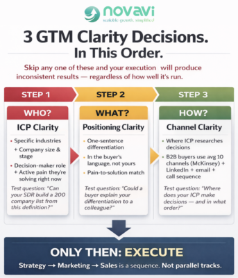 NOVAVI PRINCIPLE:  GTM clarity before amplification is the core principle behind every campaign Novavi runs. Not because it’s theoretically elegant, but because every time a client has launched without it, the pipeline leak has been the same. And every time we’ve established it first, the pipeline has compounded.